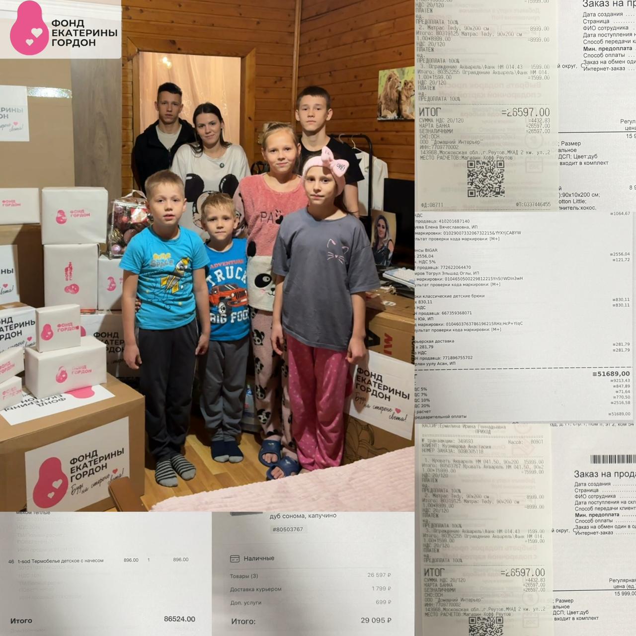Семья Рыбиных, оставшаяся без дома и … родителей. Семья, в которой старшая сестра взяла под опеку шестерых братьев и сестер, и которых в свою очередь взялся поддерживать «Фонд Гордон» получила наши подарки и помощь. (От кроватей до елки и посуды). Мы не оставим их и дальше.